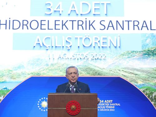 Hidroelektrik potansiyelini daha hızlı harekete geçirmek için 2003 yılında özel sektörün bu alandaki yatırımlarının önünü açarak tarihî bir adım attıklarını anımsatan Cumhurbaşkanı Erdoğan, şunları söyledi: "Böylece hidroelektrik üretim kapasitemizi kısa sürede 2,5 kat artırarak 44 milyar kilovatsaatten 110 milyar kilovatsaate çıkardık. Hâlihazırda ülkemizin toplam kurulu gücünün üçte birini hidroelektrik oluşturmaktadır. Bir başka ifadeyle ülkemizde yanan her üç lambadan birinin elektriği, su kaynaklarımızdan gelmektedir. Bugün dünyada dokuzuncu sırada yer aldığımız hidroelektrik gücümüze, 34 yeni tesis daha kazandırıyoruz. Kamu özel sektör iş birliğiyle 20 farklı ilimizde faaliyete geçecek 34 hidroelektrik santralimiz, 653 kilovatsaat kurulu güce ve yıllık 2,3 milyar kilovatsaat enerji üretim kapasitesine sahiptir. Yatırım bedeli 16 milyar lirayı bulan bu santraller ülkemize yıllık 2,7 milyar lira ekonomik fayda sağlayacaktır. Kendilerini altı yılda amorti edecek hidroelektrik santrallerimiz ardından uzun yıllar boyunca ekonomimize katma değer sağlamaya devam edecektir."