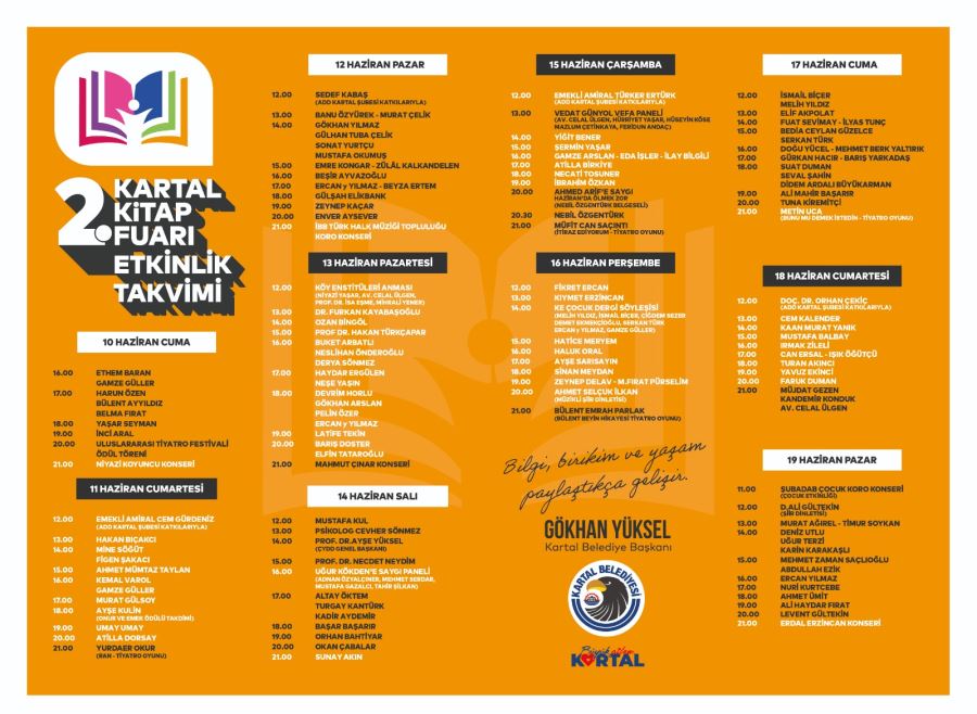 Kartal Belediye Başkanı Gökhan Yüksel Kartal Kitap Fuarı ile ilgili: “Göreve geldiğimiz günden bu yana Kartal’ımızı; tiyatro oyunları, fuarlar, konserler, uluslararası festivaller, kutlama ve anma programları, sergiler ve daha birçok etkinlik ile kültür sanat hayatının İstanbul’daki yeni merkezi haline getirme çalışmalarımıza öncülük ediyoruz. Bu çalışmalardan bir tanesi de geçen sene büyük bir organizasyon ile ilkini düzenlediğimiz, tüm İstanbulluların ve hatta çevre illerden vatandaşların yoğun katılım gösterdiği Kartal Kitap Fuarı. Büyük bir kültür hizmeti sunarak birbirinden değerli yayınevlerini, yayıncıları, sanatçıları, şair ve yazarları aynı çatı altında buluşturduğumuz Kartal Kitap Fuarımızın bu yıl ikincisini gerçekleştiriyoruz.Onlarca söyleşi, imza ve kültür etkinlikleri ile okurlar ve yazarlar arasında güçlü bir köprü kurmaya çalıştığımız fuarın, geçen sene olduğu gibi bu sene de İstanbul’un her yerinde yankı bulacağını düşünüyor, tüm komşularımızı 10-19 Haziran tarihleri arasında gerçekleştirilecek olan ve her gün 10.00-22.00 saatleri arasında açık olacak fuara davet ediyorum” dedi.