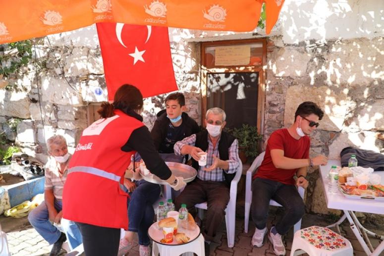 Kızılay, 60 bin 655 kişilik beslenme kapasitesi ile evleri hasar gördüğü veya yıkıldığı için geceyi dışarıda geçirmek durumunda kalan vatandaşlara 7/24 sıcak yemek desteği sağlıyor. Bölgede bulunan 5 ikram aracı, 5 mobil mutfak, 3 sahra mutfak ile 8 öncü araç ve 20 çeşitli görevde kullanılan araçla depremzedelerin yanında yer alan Kızılay, depremin meydana geldiği ilk dakikadan itibaren toplam 10 bin 026 paketli gıda, 7 bin 198 sıcak içecek, 6 bin 216 soğuk içecek ve 28 bin 657 su dağıtımı gerçekleştirdi. Sabahları verilen kahvaltının yanı sıra öğlen ve akşam olmak üzere 3 öğün sıcak yemek ve içecek desteğinde bulunan Kızılay yardım elini depremzedelere uzatmaya devam ediyor. Depremin meydana gelmesinin hemen ardından 85 personel, 45 şube görevlisi ve 193 gönüllüsüyle bölgeye intikal eden Kızılay, depremin ilk anından bugüne toplam 60 bin 655 öğün sıcak yemek desteğinde bulundu. Üç öğün olarak gerçekleştirdiği sıcak yemeğin yanı sıra çorba, bisküvi, kek, vb. ikramlıklar dağıtmayı da ihmal etmeyen Kızılay, temel gıda ve beslenme yardımlarını aralıksız sürdürüyor. İzmir Afet Müdahale Merkezi yerleşkesinde kurulan sahra mutfak kitinde üretimi gerçekleştirilen sıcak yemekleri geceyi dışarda geçirmek durumunda kalan depremzedelerin hizmetine sunuyor.