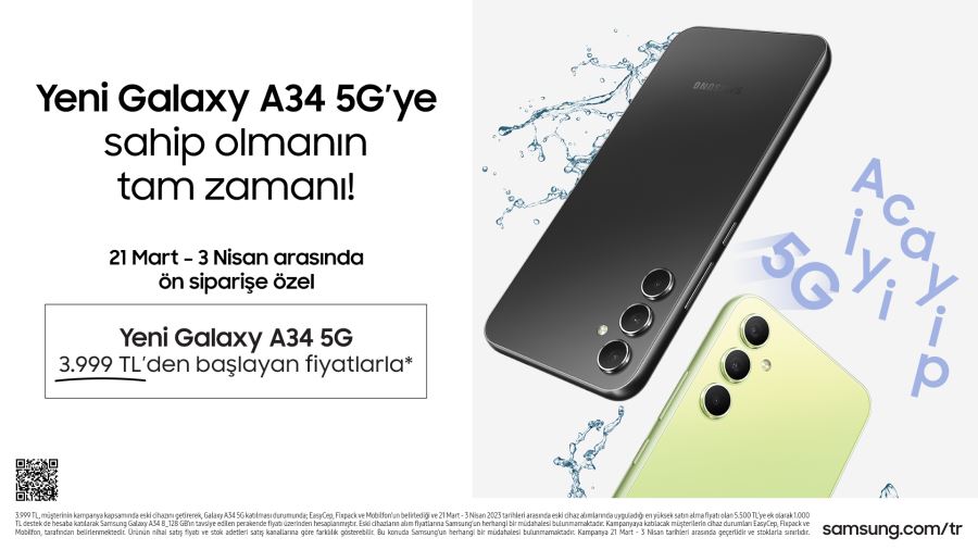 Samsung, Galaxy inovasyonlarını herkes için sunan Galaxy A Serisi’nin en yeni üyeleri Galaxy A34 5G ve A54 5G’yi ön satışa sundu. 21 Mart - 3 Nisan tarihleri arasında geçerli olacak ön satış kampanyası kapsamında, kullanıcılar yeni Galaxy A34 5G ve A54 5G akıllı telefonları avantajlı teklif ve kampanyalarla satın alabilecekler.